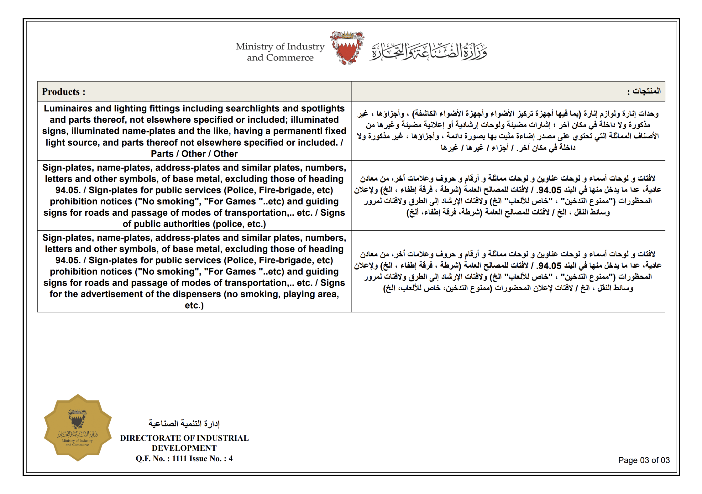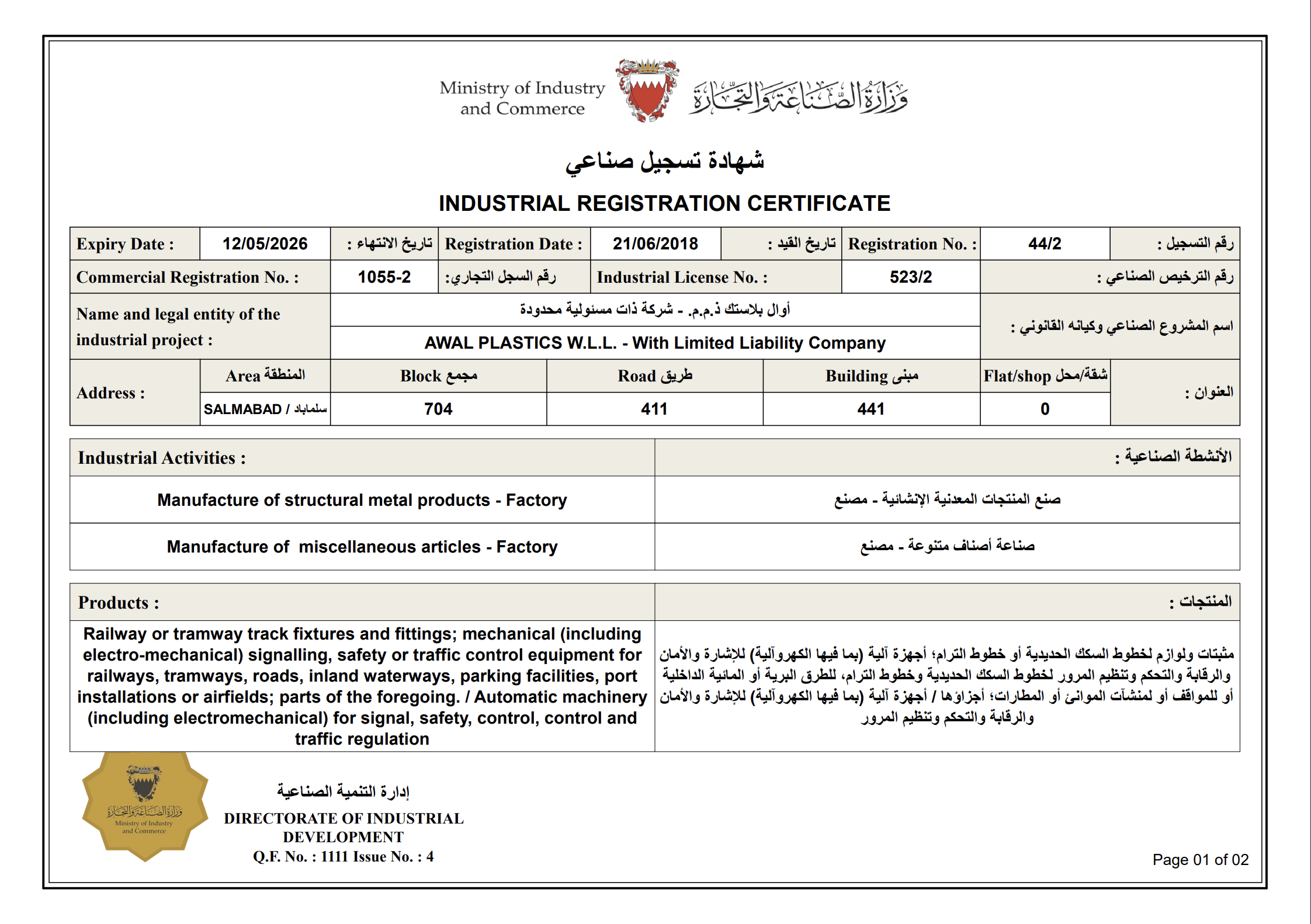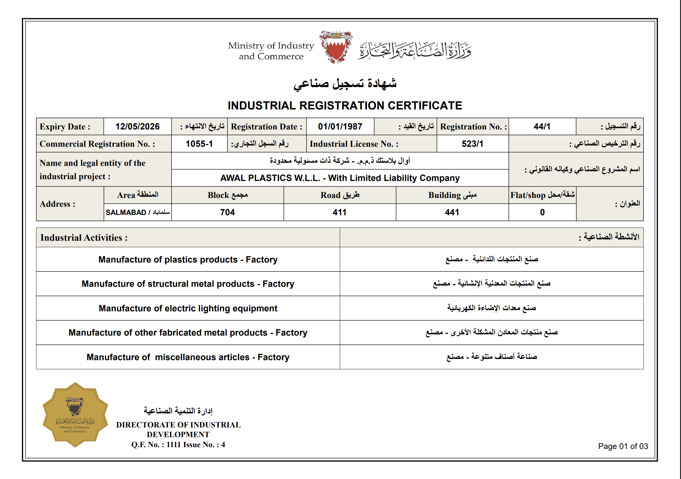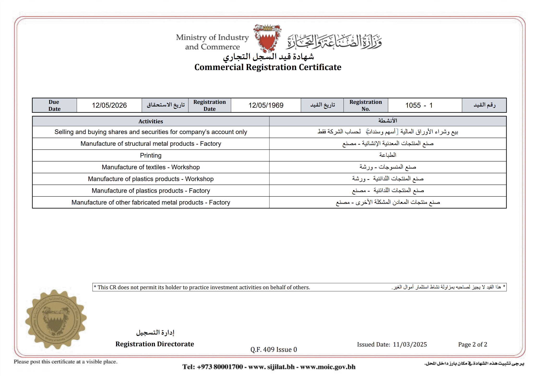 MADE IN BAHRAIN MARK REGISTRATION CERTIFICATE